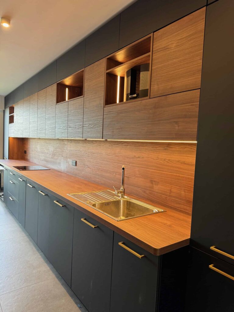 Façades stratifiées noir mat, poignées cuivrées, plan de travail stratifié noyer.